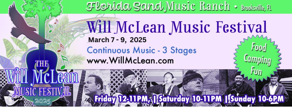 The Will McLean Music Festival was first held at the headsprings of the Rainbow river in 1990 just a few months after Will's passing. The Festival, now a 3 day multi-stage event held in March, features performances, workshops, open mics, dances and jams. Our “Young Performer Showcases” have become a festival favorite for many fans as they watch these youngsters grow every year with more skill and confidence.