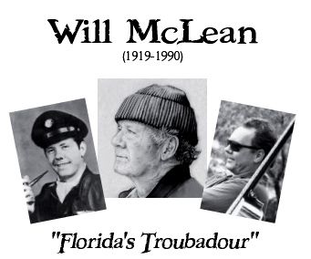 The late Will McLean is best known as Florida's premier folk song writer. McLean was born in 1919 near Chipley, Florida. He spent most of his life in the woods and writing songs. McLean's love of music was nurtured by his grandfather who gave him his first instrument, a gourd and cornstalk fiddle with a horsehair bow. At the age of six, he wrote his first song, "Away O'ee."